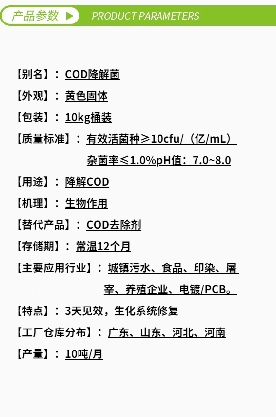 【使用條件】溶解氧:2~5 mg/L;溫度:15~40℃,最適 28~35℃;pH: 6~8;鹽度:≤15000mg/L;不含重金屬;不含生物毒性化合物。