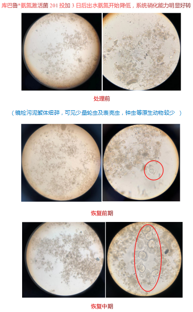 (3)投加庫(kù)巴魯®氨氮激活菌201,恢復(fù)系統(tǒng)硝化能力,改善生化處理效率。