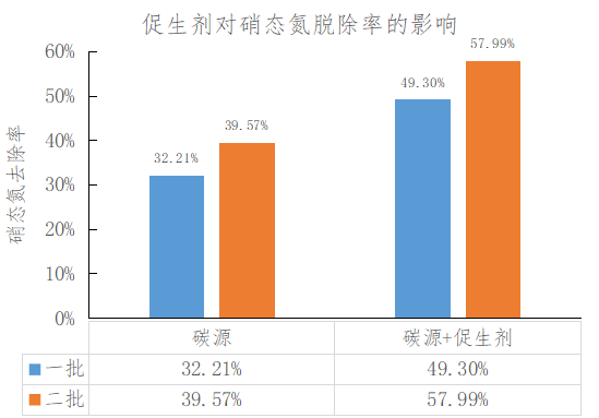 促生劑對反硝化脫氮的促進作用以某廠化工污水生化處理過程中的脫氮效果為例,添加水體十萬分之一的促生劑能夠提升17.09%-18.42%的硝態氮脫除率。